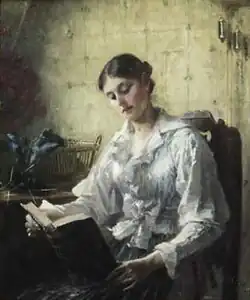 - Im Atelier (Junge Malerin mit Pinsel und Palette vor ihrer Staffelei stehend), 1888