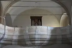 Bei der Restaurierung 1968 wurden Fresken aus den Jahren um 1400 freigelegt: an den Chorwänden ca. 20 rekonstruierbare Medaillons mit Halbfiguren der Apostel alternierend mit Propheten, denen in Banderolen Sätze des Glaubensbekenntnisses beigeordnet sind. Darüber, in den Chorschrägen sind großfigurige, thronende Könige und Propheten, deren einst plastisch gebildete Köpfe als Rippenkonsolen dienten. Die rechte Chorschräge zeigt Vera Ikon und Daniel in der Löwengrube, an der Nordwand die Inschrift ...orare deum per animam johanne aquila picture, welche sich auf den Maler der Fresken Johannes Aquila bezieht. An der südlichen Langhauswand zeigen Freskenreste eine Madonna in einem Seitenaltar, seitlich zwei Heilige und im Gesprenge musizierende Engel.