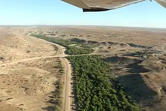![]() Luftaufnahme (2017) bei 24°51′58″S 018°48′20″E Blick flussaufwärts auf den Auob bei Gochas | ||