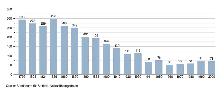 - ↑ Daten der Eidgenössischen Volkszählungen ab 1850 nach Gemeinden. (XLSX; 10 MB) Bundesamt für Statistik, Neuchâtel, 12. Juli 2024, abgerufen am 21. Januar 2025 (Öffnung in Excel nur über "Anhang/Excel-Datensatz" möglich).