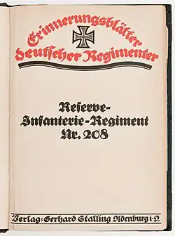Erinnerungsblätter deutscher Regimenter ist eine Buchreihe, die nach Ende des Ersten Weltkriegs bis in die 1940er Jahre hinein veröffentlicht wurde. Jeder Band beschrieb die Einsatzgeschichte eines Regiments oder selbständigen Bataillons des deutschen Heeres im Weltkrieg. Insgesamt erschienen 1.250 Bände.[1] Die Erinnerungsblätter erschienen in vier regionalen Teilen mit separat laufender Nummerierung für die preußischen, bayerischen, sächsischen und württembergischen Einheiten. Letztere regionale Reihe trug den Titel Die württembergischen Regimenter im Weltkrieg.