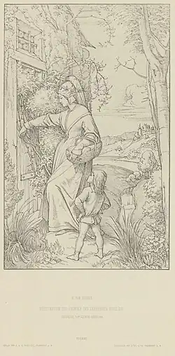 - Eingelegte Gedichte unterstreichen nicht nur die Melancholie, sondern unterstützen auch noch die tiefere Sinnsuche: Die verlassene Mutter, am Spinnrad ihrem Kinde vorsingend, finde sich mit ihrem Schicksal ab.[28]