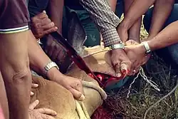 • Für die Schlachtung kommen zwei Methoden in Betracht, Dhabh (ذبح / ḏabḥ) und Nahr (نحر / naḥr). Die Nahr-Methode wird nur bei Kamelen und seltener bei Rindern angewandt. Hierbei wird dem stehenden Tier ein scharfes Messer in die Kehle gestoßen. Die Dhabh-Methode kommt bei allen anderen Tieren (Rindern, Ziegen, Schafen, Geflügel) zur Anwendung. Hierbei werden dem Tier, das auf die linke Seite gelegt wird, in einem einzigen Schnitt Kehle und Halsadern durchtrennt. Nur wenn es nicht möglich ist, die Kehle des Tieres zu erreichen, etwa weil es davonläuft, ist es erlaubt, das Tier an einer anderen Körperstelle zu verletzen. Diese letztgenannte Art der Schlachtung wird ʿAqr (عقر) genannt.[38]