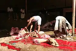 Gemäß den islamischen Vorschriften müssen Haustiere (Kamele, Rinder, Schafe, Ziegen, Geflügel) nach einem speziellen Ritus geschlachtet werden, der Dhakāt (ذكاة / ḏakāh) genannt wird[36] und in einzelnen Punkten dem jüdischen Schächten ähnlich ist. Nur Fleisch von Tieren, die nach diesem Ritus geschlachtet sind, gilt als halāl. Der Dhakāt-Ritus erfordert die Einhaltung folgender Vorschriften: