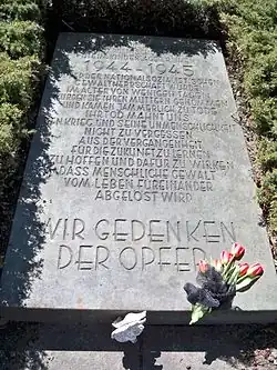Hier ruhen über 100 russische und polnische Kinder die im Kinderlager Rühen 1944 – 1945 Opfer nationalsozialistischer Gewaltherrschaft wurden. Im Alter von wenigen Tagen wurden sie ihren Müttern genommen und kamen jämmerlich zu Tode. Ihr Tod mahnt uns, den Krieg und seine Unmenschlichkeit nicht zu vergessen, aus der Vergangenheit zu lernen, zu hoffen und dafür zu wirken, dass menschliche Gewalt vom Leben füreinander abgelöst wird. WIR GEDENKEN DER OPFER |