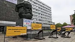 Der Brandenburger Bildhauer Rainer Opolka veranstaltete am 13. September 2018 am Karl-Marx-Denkmal mit zehn Bronzewölfen eine eintägige Kunstaktion gegen Hetze und Gewalt in Chemnitz. Einige der Tierplastiken zeigten den Hitlergruß, andere stellten Mitläufer dar. Flankiert wurde diese Aktion mit Schildern mit Sätzen wie „Wo gehetzt wird, wird später auch getreten!“ und „Herr Maaßen und Herr Seehofer: Rechtsradikalismus ist die Mutter aller Probleme“.[148]