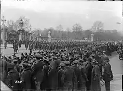 Am 1. Januar 1901 schlossen sich die sechs australischen Kolonien South Australia, New South Wales, Tasmanien, Victoria, Queensland und Western Australia zum Commonwealth of Australia zusammen, das als Dominion des Britischen Empire gegründet wurde. Australien besaß nun eine eigene föderale Regierung und innere Selbstverwaltung, doch die Außen- und Verteidigungspolitik blieb zunächst weitgehend unter britischer Kontrolle.[5] So trat Australien mit Ausbruch des Ersten Weltkriegs automatisch an der Seite Großbritanniens in den Krieg ein, denn als Großbritannien im August 1914 Deutschland den Krieg erklärte, befand sich auch Australien als Dominion automatisch im Kriegszustand. Australische Truppen kämpften im Ersten Weltkrieg als Teil der britischen und alliierten Streitkräfte, unter anderem in der Schlacht von Gallipoli 1915 (gemeinsam mit neuseeländischen Verbänden als ANZAC) sowie an der Westfront in Europa. Insgesamt 60.000 von über 400.000 australischen Soldaten starben in dem Krieg.[6] In der australischen Innenpolitik war der Kriegseinsatz nicht unumstritten und in zwei Referenden sprach sich jeweils eine knappe Mehrheit der Abstimmenden gegen eine Wehrpflicht für Australier aus.[7]