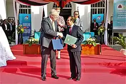 Die Premierminister Scott Morrison und Taur Matan Ruak tauschen in einer Zeremonie in Dili die ratifizierten Verträge aus.