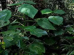 Ihre Laubblätter sind schildartig, leicht herzförmig, spitz bis zugespitzt und gezähnt. Sie ähneln in der Form jener der Linde. Die flaumig behaarten Blattspreiten werden 12 bis 22 Zentimeter lang und 11 bis 18 Zentimeter breit. Sie verfügen über sechs bis acht Paare an Blattadern, wobei das basale Paar deutlich hervortritt. Der Blattstiel ist zwischen 10 und 18 Zentimeter lang und verfügt über 1 Zentimeter lange Nebenblätter.