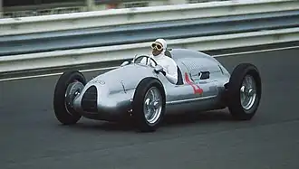 Die Entwicklung der Auto-Union-Rennabteilung bei Horch in Zwickau leitete von 1934 bis 1937 Ferdinand Porsche. Ab 1938 war Robert Eberan von Eberhorst Leiter der Rennabteilung. Die Mittelmotorwagen der Silberpfeil-Ära (1934 bis 1939) waren die einzigen Konkurrenten, die die Mercedes-Benz-Rennwagen besiegen konnten.[17] Bernd Rosemeyer, Hans Stuck, Ernst von Delius, Rudolf Hasse[18], Hermann Paul Müller[19] und Tazio Nuvolari waren die Fahrer. 1936 gewann Rosemeyer auf Auto Union die Grand-Prix-Europameisterschaft.[20]