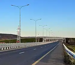 Bereits Ende der 1980er Jahre wurde der Bau einer Brücke über den Fluss Kama geplant. Sie sollte die Stadt Kasan mit dem Süden Tatarstans verbinden, der bis dahin nur mit der Fähre zu erreichen war. Der Bau der Brücke über die Kama zwischen Sorotschi Gory und Alexejewskoje begann 1989, wurde aber 1991 vorerst eingestellt. Während des Baustopps wurden Pläne entwickelt, die Straße nach Bawly als Autobahn zu verlängern, um in ferner Zukunft die Autobahn über Orenburg bis zur russisch-kasachischen Grenze bei Sagartschin zu verlängern und Tatarstan an den Westeuropa-Westchina-Verkehrskorridor aus wirtschaftlicher Interesse anzuschließen. Die Bauarbeiten wurden 1998 wieder aufgenommen.[3] 2002 wurde die Brücke mit einer Fahrspur pro Richtung fertiggestellt.[4] 2016 erfolgte die Erweiterung auf zwei Fahrspuren pro Richtung und die Eröffnung der zweiten Brücke.[5] Der weitere Ausbau der Straße von Sorochi Gory zur Fernstraße M7 Wolga nach Schali wurde 2010 fertiggestellt. Der Bau der Autobahn zwischen Alexejewskoje und Almetjewsk begann im Jahr 2005.[6] Finanziert wurde dieser Abschnitt von dem Privatinvestor Fuat Komarow, Eigentümer des Öl- und Gasunternehmens SMP-Neftegaz aus Almetjewsk und ehemaliger Abgeordneter der Staatsduma von 2007 bis 2011. Es handelt sich dabei um eine der ersten Straßen in Russland, die ausschließlich von einem privaten Investor finanziert wurde. Der Bau des Abschnitts verzögerte sich jedoch sehr oft, da einerseits die Finanzierungskosten oft stiegen, das Budget knapp war und andererseits die Republik Tatarstan nicht über die finanziellen Mittel verfügte, um die Straße vollständig zu investieren und auf föderale Mittel angewiesen war. Dies hatte zur Folge, dass der Bau des Abschnitts nur langsam vorankam und nur die Erdarbeiten abgeschlossen werden konnten. Nachdem der russische Vize-Ministerpräsident für Bauwesen und Regionalentwicklung, Marat Chusnullin, bis Ende 2021 föderale Mittel für den Bau der Autobahn in öffentlich-privater Partnerschaft zugesagt hatte, konnte das zu SMP-Neftegaz gehörende Straßenbauunternehmen AO Awtostrada[7] mit der Republik Tatarstan einen Konzessionsvertrag mit einer Laufzeit von 99 Jahren unterzeichnen.[8] AO Awtostrada soll Betreiber der Abschnitte Schali–Sorotschi Gory und Alexejewskoje–Almetjewsk werden. Der Abschnitt Sorotschi Gory–Alexejewskoje wird von Rosawtodor betrieben, da in diesem Abschnitt die föderale Fernstraße R239 verläuft. Am 26. Dezember 2024[9] wurde der Abschnitt Alexejewskoje–Almetjewsk offiziell für den Verkehr freigegeben. Wann mit dem Bau des Abschnitts Almetjewsk–Bawly begonnen und wie dieser finanziert werden soll, steht noch nicht fest.