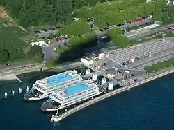 Im Jahr 2006 wurde der Konstanzer Fährhafen abermals erweitert, wobei ein eigener Platz für die Wartung der Fährschiffe nördlich des eigentlichen Hafens geschaffen wurde. Das zuvor bereits fertiggestellte Betriebsgebäude nimmt die Verwaltung der Fährebetriebe und Werkstätten auf.[36] Aus dem ersten Fährhafen wurde der neue Seglerhafen Staad.[37] Der alte Landesteg wurde vorerst eingelagert. Er wurde später aufwändig restauriert und nördlich des neuen Fährhafens wieder aufgestellt. Er dient nun als Anleger für das erste Fährschiff, für das er ursprünglich geplant wurde, das von einem Verein restaurierte Fährschiff Konstanz.[38]