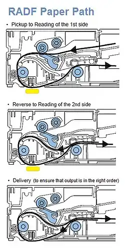 - ARDF (englisch Automatic Reverse Document Feeder)-[3] / RADF (englisch Reverse Automatic Document Feeder)-Varianten[2] wenden das Blatt nochmals im Dokumenteneinzug und führen es für das Scannen der Rückseite nochmals am Laser- oder LED-Scanelement vorbei.[4] Da Rückseite und Vorderseite eingescannt sind, ist der Fachbegriff hierzu Duplex oder Duplex-ADF[5].