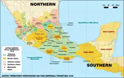 Obwohl sie von den Azteken nicht auf diese Weise beschrieben wurden, gab es im Wesentlichen zwei Arten von Provinzen: Tributpflichtige und strategische Provinzen. Strategische Provinzen waren im Wesentlichen untergeordnete Vasallenstaaten, die dem aztekischen Staat im „gegenseitigen Einvernehmen“ Tribut oder Hilfe leisteten. Tributprovinzen hingegen zollten dem Reich regelmäßig Tribut; Verpflichtungen seitens der Tributprovinzen waren eher obligatorisch als einvernehmlich.[34][35]
