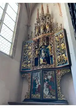 Die Mensa des Retabels besteht aus Tuffstein. Das dreiteilige Flügelretabel besteht aus der Predella, dem Hauptschrein und einem Gesprenge. Auf den Außenseiten der Flügel sind 4 Szenen aus dem Marienleben zu sehen mit Verkündigung, Heimsuchung, Geburt Jesu und Anbetung. Die Standflügel versah man mit Malereien der vier hl. Jungfrauen Apollonia, Dorothea, Katharina und Barbara. Die Außenseiten der Predella-Flügel zeigen die Darbringung Jesu im Tempel und den Tod Mariens.[2] Im seitlichen Rankenwerk sind zwei Wappen der Bäckerzunft eingearbeitet. Der Predella-Schrein ist in zwei Felder unterteilt, wobei sich im unteren eine neugotische Beweinung Christi befindet. Darüber entspringt die Wurzel Jesse als reich vergoldetes Schnitzwerk, das sich auf den Innenseiten der Altarflügel fortsetzt und die Ahnen Jesu trägt. Die zentrale Figur im Altarschrein stammt aus dem 19. Jahrhundert und stellt eine thronende Maria mit Jesuskind im Arm und Zepter in der Hand dar, die von zwei Engeln gekrönt wird. Im Gesprenge stehen die drei hl. Bischöfe Wolfgang, Ulrich und Nikolaus unter prächtigen Fialen.[3]