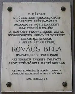 Nachdem Béla Kovács zwei Jahre lang das Amt des Generalsekretärs der Kleinlandwirte-Partei ausübte, wurde er am 25. Februar 1947 von der sowjetischen Polizei verhaftet. Ihm wurde vorgeworfen, er habe eine Verschwörung gegen die Republik geplant. Angeblich soll er mit der Organisation Magyar Közösség (Ungarische Gemeinschaft) versucht haben, das Regime des früheren Reichsverwesers Miklós Horthy wiederzuerrichten. Ohne ihm einen Prozess zu machen, wurde Kovács in eines der gefürchteten Arbeitslager in Sibirien gebracht und sollte dort über einen Zeitraum von zwanzig Jahren Zwangsarbeit verrichten.