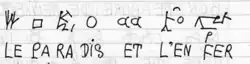 Das letzte Zeichen „fer“ bedeutet Eisen, und „et“ bedeutet „und“. Das Zeichen, das dem „und“ entspricht, setzt sich aus zwei einzelnen Zeichen zusammen, für die es kein einzelnes Zeichen gibt. In beiden Fällen sind die Zeichen keine Piktogramme für das, was sie bedeuten. Es handelt sich jedoch um eine Silbenschrift, so dass „ra“ zum Beispiel kein Wort, sondern eine Silbe ist. Die Silbe „dis“. Diese Silbe bedeutet zum Beispiel auch „sagen“.