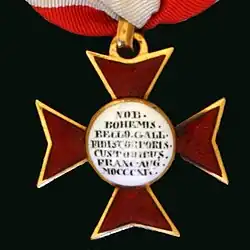 Das Ordenszeichen ist ein goldenes achtspitziges rot emailliertes Kreuz. Im Medaillon zeigt es einen weiß emaillierten, nach links blickenden aufrecht stehenden Löwen. Rückseitig die siebenzeilige Inschrift NOB. BOHEMIS. BELLOGALL. FIDIS CORPORIS CUSTODIBUS. FRANC.AUG. MDCCCXIV. (Den böhmischen Adeligen, den treuen Leibwächtern während der Franzosenkriege Kaiser Franz 1814).