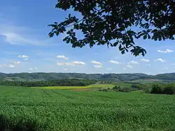 Blick von Böllstein (Wallbrunn) nach Westen: über Gneis-Hügel (rechts: Schnellerts, links: Eichberg-Rücken) und das Gesprenztal zum Flasergranitoid-Höhenzug Neunkircher-Höhe - Nonrod