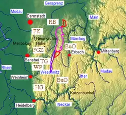 - ↑ Verschiedene Autoren: Geographische Landesaufnahme: Die naturräumlichen Einheiten in Einzelblättern 1:200.000. Bundesanstalt für Landeskunde, Bad Godesberg 1952–1994. → Online-Karten der naturräumlichen Einheiten; hier: Blatt 151 Darmstadt (Otto Klausing 1967; 61 S.)