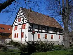 - Restauriertes Fachwerkgebäude des Kinderhorts mit Turm und Kreuz