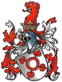 Blasonierung: In Silber ein roter Ring außen mit vier roten Blättern besteckt. Auf dem gekrönten Helm ein roter Brackenkopf. Die Helmdecken sind rot-silbern.[4]