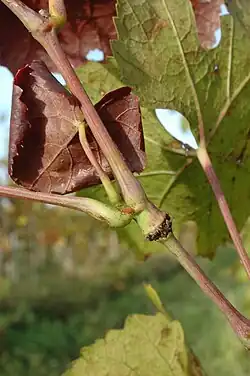 Blattfarbveränderung (Rotfärbung) bei einem Rebtrieb oberhalb der Einstiche (Triebverdickung, Wucherung) verursacht durch Büffelzikaden.