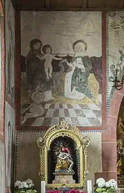 - über dem linken Seitenaltar vor einem roten Vorhang und auf perspektivisch sich in die Tiefe verjüngenden Kacheln „Anna selbdritt“, also Anna, die Mutter Marias, Maria und das Jesuskind, darunter klein und kniend ein ritterlicher Stifter mit dem Spruchband „O mutter der barmherzigkeit, bitt für die ganze Christenheit“;