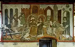 Es folgt das große Laurentiusbild, das besterhaltene und künstlerisch bestgelungene Gemälde der Kapelle. Laurentius hatte als Erzdiakon von Rom das Kirchenvermögen zu verwalten. Von Kaiser Valerian zur Herausgabe aufgefordert, verteilte er es an die Armen und führte die Armen dem Kaiser vor mit den Worten, sie seien „die wahren Schätze der Kirche“. Darauf wurde er auf einem Rost über Feuer zu Tode gemartert.[17] Der Maler hat drei Begebenheiten vereinigt.