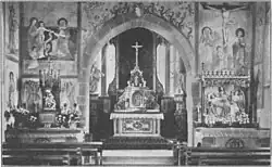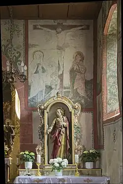 - über dem rechten Seitenaltar eine Kreuzigungsgruppe mit dem Gekreuzigten, Maria und Johannes, darunter wieder klein und kniend ein ritterlicher Stifter mit dem Spruchband „O jesu, die hl. wunden dein, meine zuflucht sein“.[13]