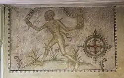 Blätterwerk ähnlich dem am Chorbogen, aber feiner und schwungvoller gemalt, schmückt die Laibungen der vier Fenster des Langhauses.[14] Über den Fenstern weisen Symbole auf das Kirchenjahr hin, und zwar