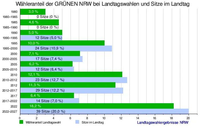 Bei der Landtagswahl 2022 konnten die Grünen ein Rekordergebnis erzielen; sie erhielten 18,2 Prozent der Stimmen, was 39 Sitzen im Landtag entspricht. Nachfolgend gingen sie eine schwarz-grünen Koalition unter der Führung von CDU-Ministerpräsident Hendrik Wüst ein und übernahmen vier Ministerposten.