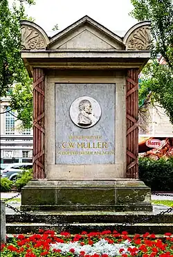 Das Bürgermeister-Müller-Denkmal wurde nach einem Entwurf von Johann Friedrich August Tischbein (1750–1812) durch den Leipziger Baudirektor August Wilhelm Kanne (1784–1827) geschaffen. Es besteht aus ockerfarbenem Cottaer Sandstein und rotem Buntsandstein. Eine über zwei Meter hohe in klassizistischem Stil verzierte quadratische Steinsäule mit Sockel und Deckplatte ruht auf einem dreistufigen Fundament. An den Ecken verlaufen Rutenbündel. Die Deckplatte trägt Dreiecksgiebel und Akroterien. Die nach Süden gerichtete Seite trägt eine Marmorplatte mit einem Porträtmedaillon Müllers, das vom Berliner Bildhauer Johann Gottfried Schadow (1764–1850) stammt; darunter die vergoldete Inschrift BÜRGERMEISTER | C. W. MÜLLER | SCHÖPFER DIESER ANLAGEN. Die Gegenseite zeigt eine Lyra mit Eichenkranz. Auf der Westseite stehen die Lebensdaten Müllers und auf der Ostseite VON DEN DANKBAREN | BÜRGERN LEIPZIGS.
