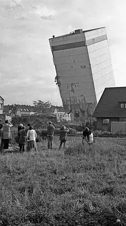 Außergewöhnlich war es im Oktober 1980, als das Silo der ehemaligen Krefelder Malzfabrik Hoesch-Vial GmbH an der Kölner Straße/Vulkanstraße gesprengt wurde. Das 25-Meter hohe Gebäude blieb beim ersten Sprengversuch in einer Schräglage stehen und überstand drei weitere Sprengversuche. Erst beim fünften Versuch zwei Wochen später gab das Bauwerk nach und stürzte ein. Der Firmenkomplex wurde überregional als Schiefer Turm von Fischeln bekannt.[13][14]