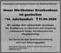 „Todesanzeige“ für das Wertheimer Krankenhaus im April 2024