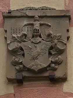 Blasonierung: In einem golden eingefassten blauen Schild steht auf grünem Dreiberg ein links gewendeter und rechts sehender goldener Adler mit zum Flug erhobenen Flügeln. Freiherrnkrone über dem Schild. Auf dem gekrönten Helm mit rechts blau-silberner, links rot-silberner Decke ein vorwärts gekehrter, blau gekleideter Mann wachsend, mit goldenem Kragen, gleichen Ausschlägen und Gürtel halb hervor, dessen Haupt ein goldenes Barett mit einer silbernen Feder zwischen zwei blauen deckt. Mit beiden Händen hält der Mann ein silbernes Band, welches „XXXII · VIII“ gezeichnet ist, in einem Bogen vor seinem Körper erhoben.