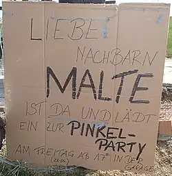 Unter der Bezeichnung Babypinkeln (auch Babybier, Pullerbier, Kindsbier, Kindpinkeln, Kinderpinkeln, Kindpissen, Pissparty, Kindsbrunzen, Pinkelparty, Füßle baden, Pieschparty, Pullerparty, Pullerschnaps, das Kind brunsen lassen, Babyparty, Wieslfest, Pinkelfete und Rumpelschnaps genannt) werden gesellige Veranstaltungen aus Anlass der Geburt eines Kindes verstanden. Dieser Brauch ist im Umfeld von Familien-, Freundes- und Nachbarschaftskreisen beheimatet.[1] Nach der Überlieferung soll dieser feierliche Umtrunk dem Neugeborenen nach der Geburt durch den Genuss der Getränke symbolisch beim Wasserlassen helfen, damit es keine Schmerzen erleidet. Teilweise wird dem Brauch des Wasserlassens allerdings eine andere Bedeutung beigemessen. Von denjenigen eingeladenen Verwandten und Freunden, welche den nackten neugeborenen Säugling im Arm halten und begutachten durften, wurde derjenige als ewiger Glückspilz angesehen, der vom Baby beim Halten angepinkelt wurde.[2]