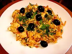 - Bacalhau à Brás (Klippfisch, der mit Kartoffelstiften und Zwiebeln gebraten wird, zuletzt werden verquirlte Eier hinzugefügt)