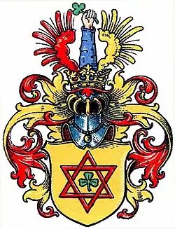 In Gold zwei wie ein Stern ineinander geschobene rote Triangel, in der Mitte ein grünes Kleeblatt. Auf dem gekrönten Helm ein roter und ein goldener Flügel, dazwischen ein aus der Krone hervorwachsender blau gekleideter Arm, dessen Hand das grüne Kleeblatt hält. Die Helmdecken in rot-gold.