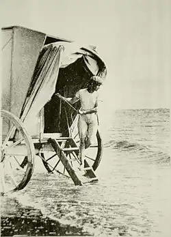 Gesellschaftsbäder, Badanlagen oder Badestrände, wie wir sie heute kennen, wurden erst gegen Ende des 19. Jahrhunderts populär. Davor wurde – wenn überhaupt – nur in den bereits seit dem Mittelalter bekannten Bade- oder Kurorten gebadet und das meistens in Wannenbädern. In diesen hatte die Badekleidung keine wesentliche Bedeutung, die Privatsphäre erlaubte nacktes Baden und durch die fehlende Schwimmmöglichkeit war auch schwere Baumwollkleidung kein Problem. Ende des 19. Jahrhunderts kamen die ersten richtigen (Strand-)Badeanstalten in Europa auf. Diese wurden zunächst – streng nach Geschlechtern getrennt – in möglichst undurchsichtiger und wollener Kleidung besucht, alles andere galt insbesondere bei Damen als unsittlich. Gewobene Baumwolle ist wenig elastisch, wird nass sehr schwer und trocknet nur sehr langsam. Während um 1900 immerhin für den Turn- und Schwimmsport der Herren bequemere und elastischere Wirk- und Strickwaren gesellschaftsfähig wurden, wurden Frauen, die sich ebenso kleideten, gebüßt oder gar verhaftet, so etwa Annette Kellerman 1907.[1] Eigentliche Sport- und Bademode begann sich erst mit dem Hygiene- und Gesundheitsdiskurs, dem Reformkleiddiskurs der Körperkulturbewegungen und den damit einhergehenden Gesundheits- und Lebensberatungen herauszubilden.[2] Diese Bewegungen ermöglichten die breite Akzeptanz bequemerer Bekleidung insgesamt und der Befreiung des weiblichen Körpers insbesondere vom Korsett. Badebekleidung im heutigen Sinn ist seit der Zwischenkriegszeit populär. Die erste schweizerische Bade-Modeschau fand 1930 im Lido (Seebad) in Luzern statt.[3]