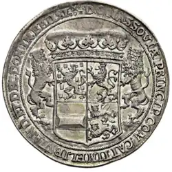 Anmerkung: Es existiert noch ein weiterer Reichstaler, der als Badehosentaler bezeichnet wird und dem Nassauer Taler ähnlich ist. Dieser Taler von 1656 ist eine Gemeinschaftsprägung der Herzöge Georg III. (Brieg), Ludwig IV. (Liegnitz) und Christian (Liegnitz-Brieg). Die Vorderseite zeigt ihre geharnischten Kniebilder, die dem nassauischen Badehosentaler entsprechen.[9]