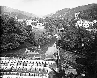 ![]() Ausleitung des Mühlbachs gegenüber der Ostspitze des Holzrechenplatzes (1910) [Anm. 1] | ||