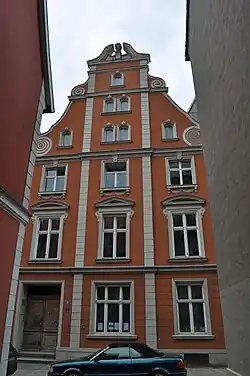 Das dreigeschossige, dreiachsige Giebelhaus stammt aus der zweiten Hälfte des 18. Jahrhunderts, ist aber im Kern älter. Die Fassade wurde in der zweiten Hälfte des 19. Jahrhunderts mit plastischem Schmuck versehen. Der Mittelrisalit tritt leicht hervor. Ein dreigeschossiger Volutengiebel mit gesprengtem Aufsatz krönt das Haus.