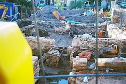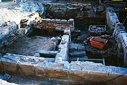 Dem Abbau des Hauptgebäudes folgten archäologische Grabungen bis hinab unter die Fundamente des Gebäudes. Ein eisenzeitlicher Rennofen zur Verhüttung von Raseneisenerz wurde ergraben, konnte aber wegen Wassereinbruchs nicht geborgen werden.[12] Etwa eine Tonne Schlackenreste aus der wesentlich älteren Metallurgie-Epoche, die auch im Betrieb des Badhauses Verwendung fanden, wurde gesichert und ebenfalls in das Freilandmuseum überführt.[12] Eisenschlacken fanden auch in der zeitgenössischen medizinischen Literatur Erwähnung, sie sollten als Badezusatz eine entsprechende Wirkung entfalten.[13]