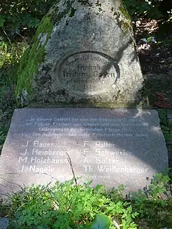 Auf dem ehemaligen Patientenfriedhof der Klinik Rastatt wurde 1899 ein Denkmal an die 19 Erschossenen errichtet. Die Kopfzeile lautet: Ruhestätte der im Jahr 1849 in Rastatt standrechtlich erschossenen FreiheitsKämpfer.[12]