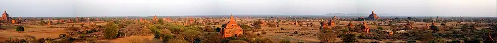Der Theravada-Buddhismus ist auch die treibende Kraft für die flächenhafte Entwicklung der Stadt. Wie im Wettlauf um die Gunst der Götter wurden, ohne die immensen Kosten in Betracht zu ziehen, Tempel, Pagoden und Klöster aus der anstehenden Tonerde erbaut und mit Sandstein, glasierten Tafeln und Stuck verziert. Nur so ist die große Anzahl sakraler Gebäude zu erklären, die in nur zweihundert Jahren entstanden. Dass das Ruinenfeld von Bagan heute so weitläufig wirkt, ist der Tatsache geschuldet, dass nur Sakralbauten aus Stein errichtet wurden. Der Bau von Wohnhäusern erfolgte hingegen aus weniger zeitbeständigen Materialien wie Holz und Bambus und hatte die Versteppung des Umlandes von Bagan zur Folge.