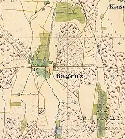 Das Ehepaar Petrik verkaufte Bagenz zwischen 1853 und 1856 an Reichsfreiherr Carl Hermann Moritz von Gärtner. 1855 wurde auf dem Gutsgelände eine Dampfbrennerei angelegt.[13] 1856 war jedenfalls von Gärtner schon Besitzer von Bagenz.[14] 1859/60 verkaufte von Gärtner Bagenz an einen NN. Maaß. Nach Riehl und Scheu stand das Gut 1860 zum Verkauf. Er nennt eine Schule, 43 Wohnhäuser und 320 Einwohner.[15] Dieser Maaß veräußerte Bagenz 1861 weiter an einen NN. von Tümpling, der Bagenz 1862 weiter an Dr. phil. Hans Köster (* 16. August 1818) verkaufte, und in dessen Besitz Bagenz bis 1872 blieb. Den Kaufpreis des Vorbesitzers (wohl Maaß gemeint) gibt Adolf Frantz mit 45.000 Talern an.[16] Das Topographisch-statistische Handbuch des Regierungs-Bezirks Frankfurt a. O. von 1867 erwähnt Bagenz als Dorf mit einer Dampfbrennerei und 15 ausgebauten Gehöften. Insgesamt wurden 46 Wohnhäuser und 311 Einwohner gezählt.[17] 1867 sollte das Rittergut Bagenz auf 14 Jahre verpachtet werden. Das Gut mit über 2000 Morgen hatte einen Tierbestand von 16 Pferden, 18 Kühen und 1000 Schafen. Die Pacht sollte etwa 1 Reichstaler 20 Groschen pro Morgen betragen.[18] 1872 erwarb Erich Karl Friedrich Wilhelm Paridam Freiherr von dem Knesebeck (* 13. Oktober 1844 in Tylssen; † 16. April 1907 auf Karwe) von Karwe im Kreis Ruppin das Rittergut Bagenz. Er war mit Helene Bertha Jeannette Eugenie Elmira Melanie von Ohlen und Adlerskron, Tochter des Johann Maximilian von Ohlen und Adlerskron auf Osseg und der Bertha geb. Lachmann verheiratet.[19] Erich Karl Friedrich Wilhelm Paridam Freiherr von dem Knesebeck ließ das Gut von einem Administrator Dierke verwalten. Die Gesamtgröße ist mit 756 ha angegeben, davon 100 ha Acker, 12 ha Wiesen, 583 ha Wald und 61 ha Unland, Ödland und Wasser. Der Grundsteiuerreinetrag ist mit 3042 Mark angesetzt. Unter der Rubrik Züchtung spezieller Viehraçen … ist die Züchtung von Angelner Rindvieh angeführt.[20] 1896 hatte der Administrator gewechselt, er hieß nun NN. Hartmann, ein Königlich-preußischer Hegemeister a. D. Die Gesamtgröße des Gures hatte sich auf 684 ha verringert, davon waren 57 ha Acker, 9 ha Wiesen, 13 ha Hutung, 549 ha Wald, 12 ha Unland und 44 ha Wasser. Der Grundsteuerreinertrag war angeblich auf 900 Mark gesunken, sicherlich ein Irrtum.[21]