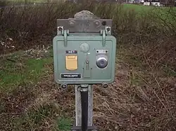 Mit der Änderung der Eisenbahn-Bau- und Betriebsordnung wurden in Westdeutschland ab 1. Januar 1961 an wenig genutzten, mehrgleisigen Bahnübergängen, die im Allgemeinen eine Breite von drei bis vier Metern aufweisen sollten, anstelle von Halbschranken Signalschirme mit einem roten Blinklicht und der darunter angebrachten gelben Leuchtschrift „2 Züge“ sowie einem Wecker errichtet.[32] Die sechzigmal in der Minute blinkenden roten Signallaternen wurde von einem sich nähernden Zug durch Befahren eines Schienenkontaktes (Einschaltpunkt) eingeschaltet; es erlosch, wenn die letzte Achse den Ausschaltpunkt am Bahnübergang verlassen hatte. Die Dauer der Blinkzeit vom Einschalten der Anlage bis zum Eintreffen des Zuges am Bahnübergang hing von den örtlichen Verhältnissen und von der Geschwindigkeit des einzelnen Zuges ab. Befuhr ein weiterer Zug einen Einschaltpunkt im zweiten Gleis, bevor der erste Zug den Bahnübergang vollständig überfahren hatte, so leuchtete das rote Blinklicht weiter auf. Gleichzeitig erschien unter dem Blinklicht eine gelbe Leuchtschrift „2 Züge“, und ein lautstarker Rasselwecker ertönte. Das Läutewerk dieses Weckers ertönte nur in Verbindung mit dem Aufscheinen der Leuchtschrift.[31] Der Verkehrsteilnehmer wurde also durch die Leuchtschrift und den Wecker darauf aufmerksam gemacht, dass die Sperrung des Übergangs nach Vorbeifahrt eines Zuges noch für einen zweiten Zug bestehen blieb. Alle wichtigen Schaltelemente der Anlage waren doppelt vorhanden. Fiel eine Teilanlage aus, blieb das vom Straßenbenutzer unbemerkt.[32] Neben dieser Neuerung wurde mit dem neuverordneten Zeichen der Blitzpfeil auf dem Andreaskreuz eingeführt, der auf eine Strecke mit Fahrleitung hinwies.[31] Die letzte dieser als Fü 2L/60 bezeichneten Anlagen, bei der noch eine Zugbegegnung beobachtet werden konnte, ging am 6. Juni 2023 in Aumenau außer Betrieb. Es existieren noch zwei dieser Anlagen in Hungen. Da bei diesen ein Gleis nicht mehr befahren wird, sind Zugbegegnungen nicht mehr möglich. Beide Anlagen sollen 2026 ersetzt werden.[33]