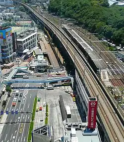 Haltestelle der Straßenbahn, darüber der Shinkansen-Viadukt -