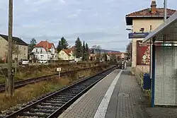 Das von Anfang an bestehende Empfangsgebäude wurde zweigeschossig erbaut und seine Länge beträgt etwa 18 Meter. Ein quer zum Gleis angeordneter Gebäudeteil entstand dreigeschossig. Im Erdgeschoss gab es Dienst- und Warteräume.[21]